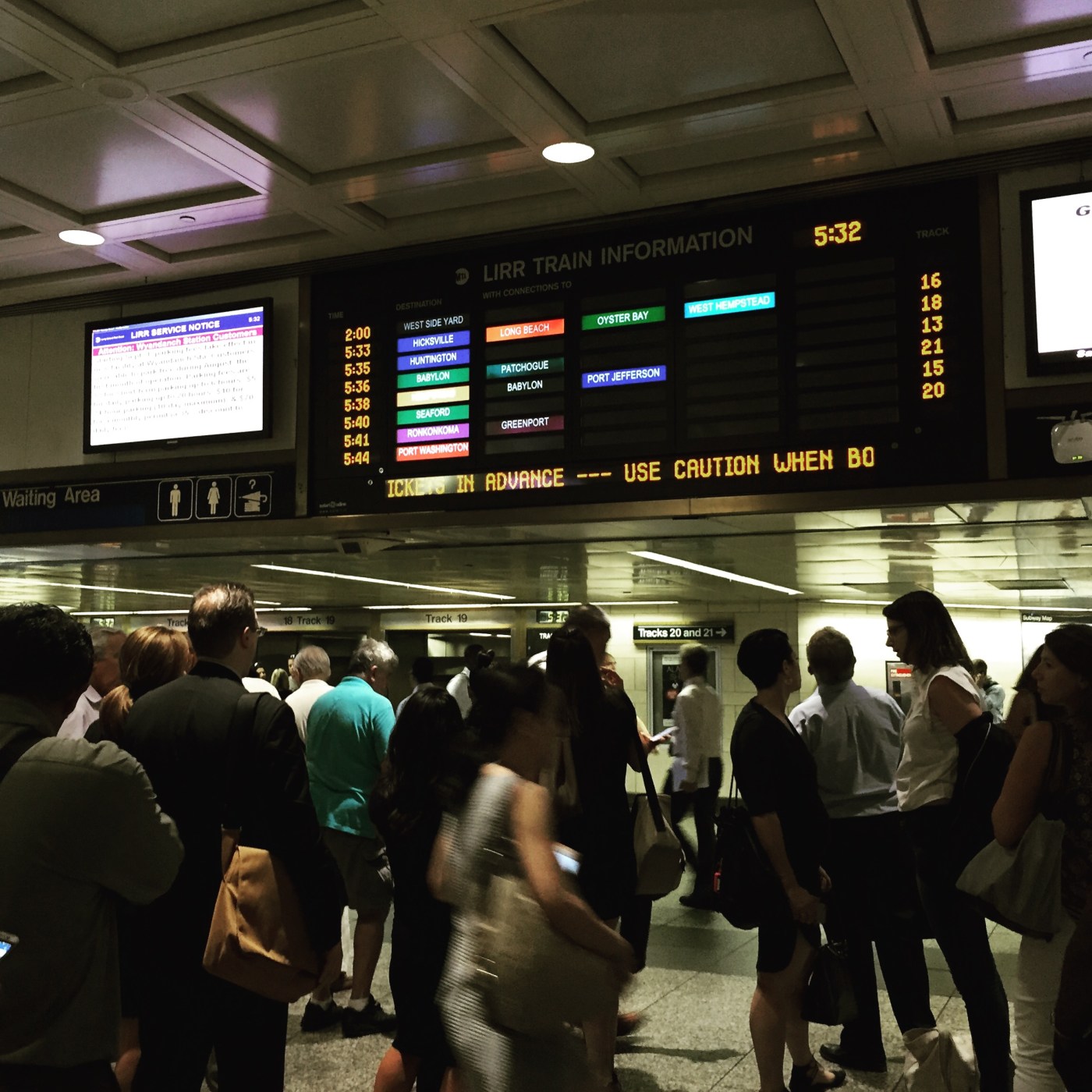 This is Penn Station, “the busiest train station in the Western Hemisphere,” according to the Municipal Art Society of New York, where half a million passengers pass through every day. It’s late afternoon on a Thursday in early September; the air is hot and thick and it smells of hot dogs, popcorn, coffee, beer, and musky cologne that’s starting to spoil after being warmed with body heat all day. It’s rush hour and there are people everywhere. Big time tables hang up in the air with the ever-changing train schedules of the Long Island Rail Road, listing the times, track numbers, destinations, and connections in vivid colors, changing every few minutes as trains come and go.