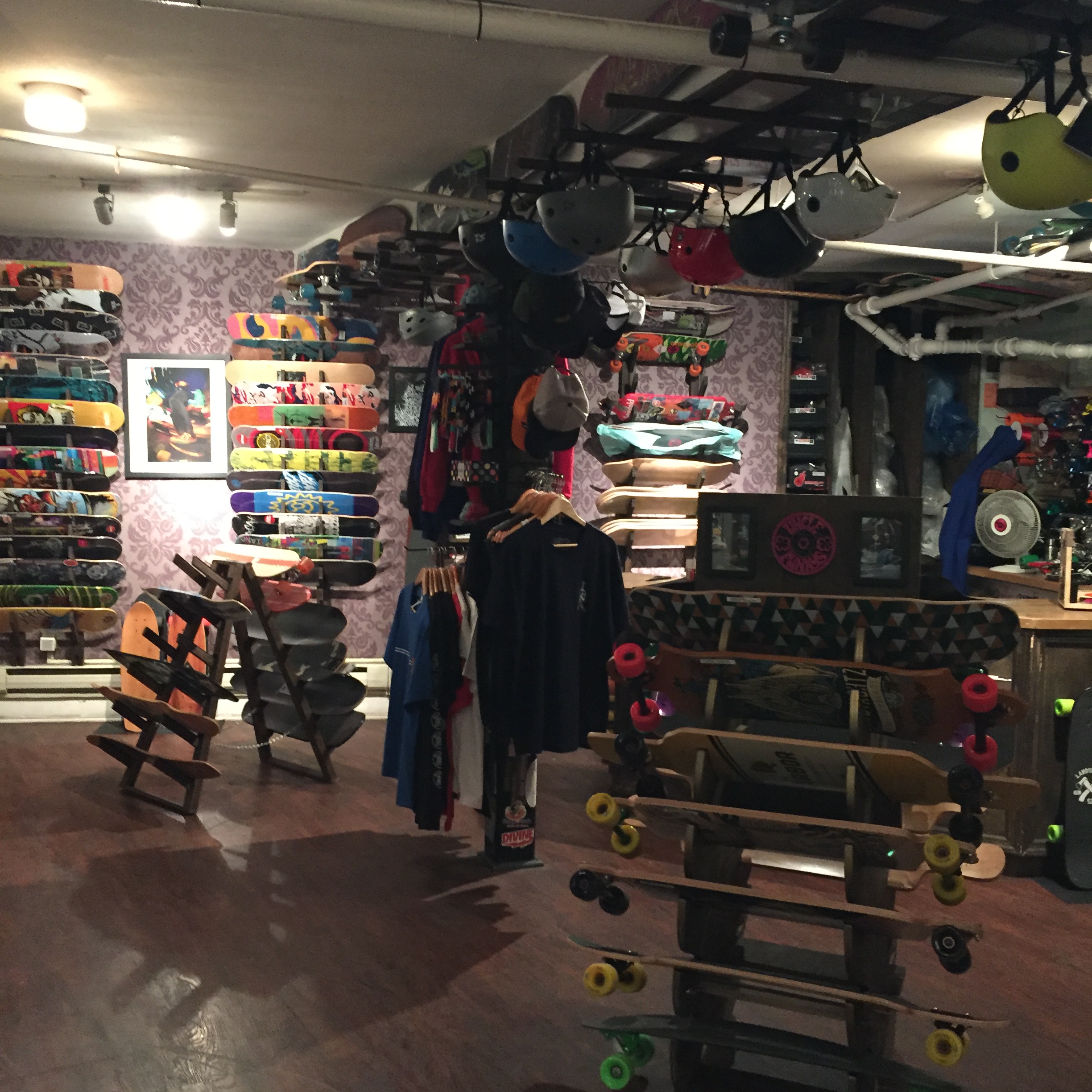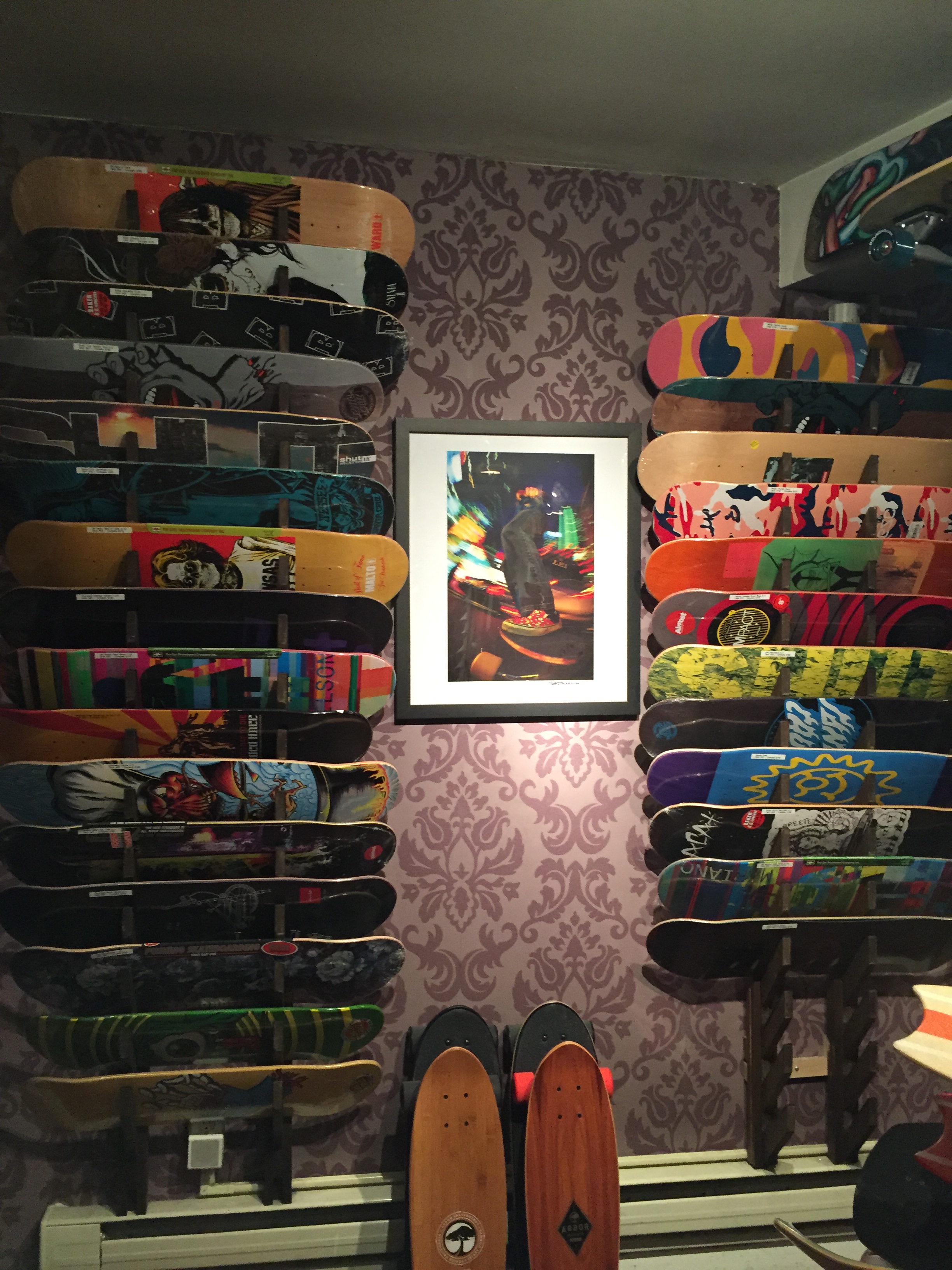 On a warm Saturday in October, customers ranging from guys in their 20s, to a teenage girl, to a little boy with parents in tow, make their way down the narrow staircase that leads to the hidden hangout that is Uncle Funky’s Boards. Incense warms the air in the psychedelic skate shop and helmets of every color dangle from the ceiling. Boards trimmed with graphics, graffiti, cartoons and logos are stacked on the patterned walls. Some boards are just bare decks, others are outfitted with neon wheels and the full setup. Skull candles and flowers in mason jars sit on the shelves along with picture frames featuring old photos of the owners, a husband and wife duo, Jeff Gaites, 45, and Kristen Howard, 34. You could be standing in someone’s living room. Rewind to about five years ago and if you wanted to buy an Uncle Funky’s board, that’s exactly where you would be – standing in Gaites and Howard’s living room.